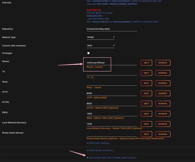 unRaid的特点就是硬件转码调取很方便,之前初始化的地方,也已经加入了集成显卡驱动。