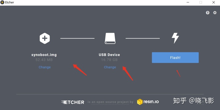 然后开始写入引导镜像,写入软件我习惯用 Etcher,页面比较友好,常见的 Win32DiskImager 也是一个原理,先选择镜像,然后选择写入设备,最后写入。