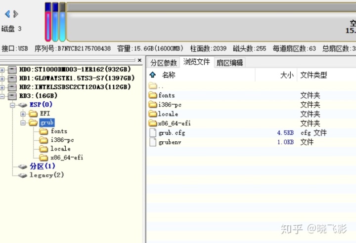 通过 DiskGenius 找到刚刚写好镜像的U盘文件,点击 grub 文件夹左侧的 + 号展开,在右侧可以看到 grub.cfg 文件,复制到桌面。