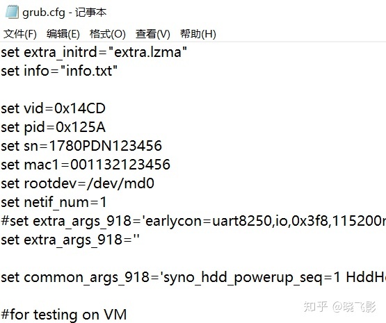用记事本的方式打开桌面的 grub.cfg 文件,找到 vid 和 pid 一栏,其中 sn 和 mac1 可以通过洗白来修改,因为我有公网IP,这个操作意义不大,现在群晖也开始实名制了,所以建议还是不要占用白裙的服务器资源。
