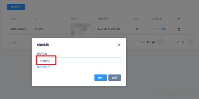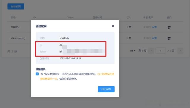 然后就得到了一个密钥ID及Token,我们先要将它们保存下来。这里需要注意的是:Token仅在创建时展示一次,直接复制到电脑上的记事本即可,不过忘记的话也没关系,可以重新创建。