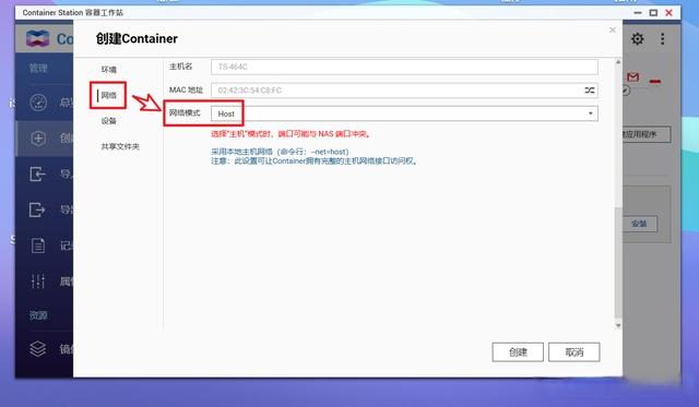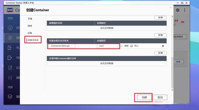 “共享文件夹”这里,在第二项这里先点击“新增”,“挂载本机共享文件夹”这里添加我们前面在“Container”目录下创建一个“ddns-go”的文件夹,后面的“挂载路径”输入“/root”即可。完整之后点击右下方的“创建”