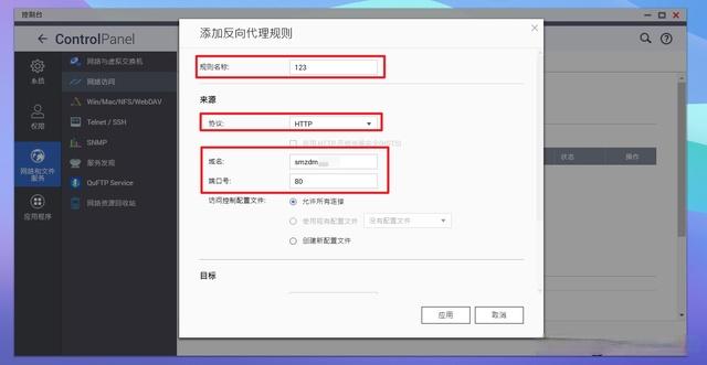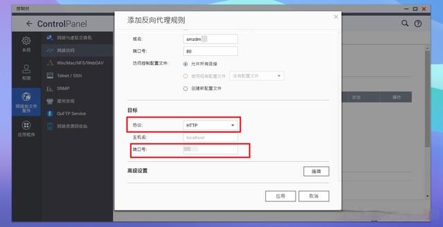 下面的「目标」这里的协议也选择HTTP,主机名不用管,默认即可,端口号请填写你目前NAS的内网端口号,最后点击“应用”即可。