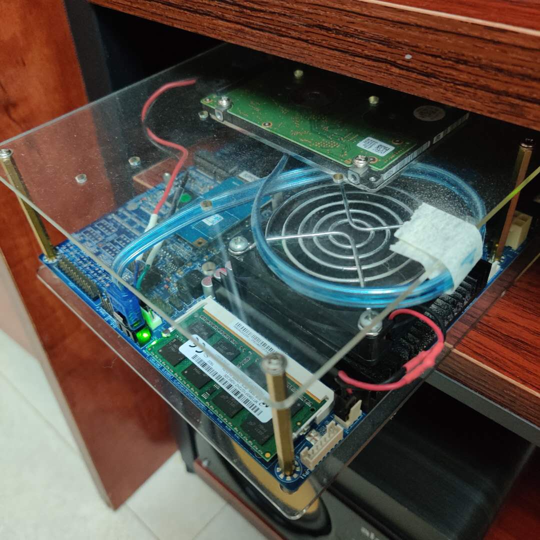 这台机子我主要是来跑各种应用的,无洗白,加上主板并不是NAS的主板,除了主板上一块MSATA硬盘,只接了一块2.5寸320G的SATA硬盘,由于是被动式散热,之前的CPU温度很高,于是在散热片上加了个风扇,现在CPU和硬盘的温度都低了很多。