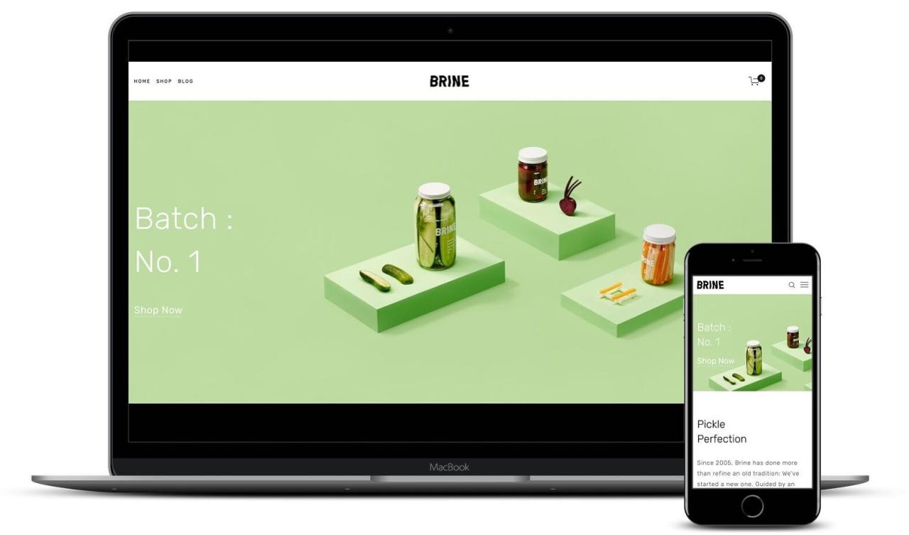 与 Hester 密切相关的是 Brine,它还在主页上展示了一些突出显示的产品,并附有 CTA。 它专为需要图像和文本的良好平衡、高级电子商务功能、彩色登录页面和基本、直接的 CTA 的在线商店而开发。