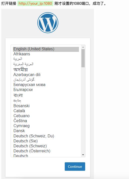 -e WORDPRESS_DB_HOST : 链接的docker的MySQL的IP地址和端口,一般设置成mysql表示用默认的设置