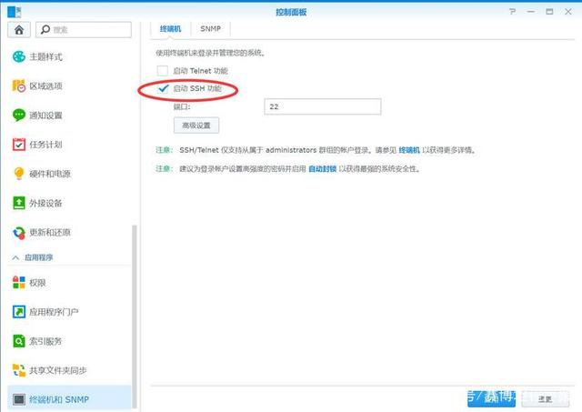 从控制面板中打开终端机和SNMP界面,在终端机选项卡中,启动SSH功能。(群晖的SSH功能每次重启NAS后会自动关闭,如果以前打开了但是重启过NAS仍然需要再打开一次)