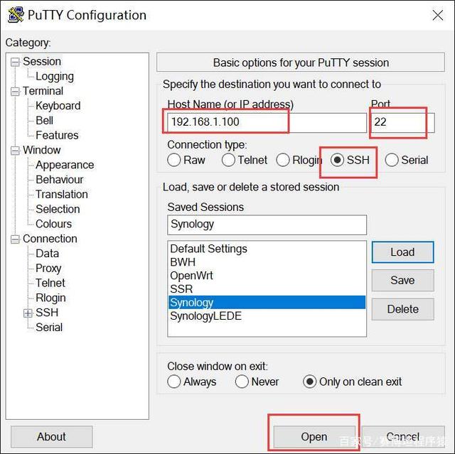 使用SSH客户端(例如最常用的putty,下载链接见文末)连接群晖NAS。在putty中输入NAS的IP地址,连接方式使用SSH,端口使用22。