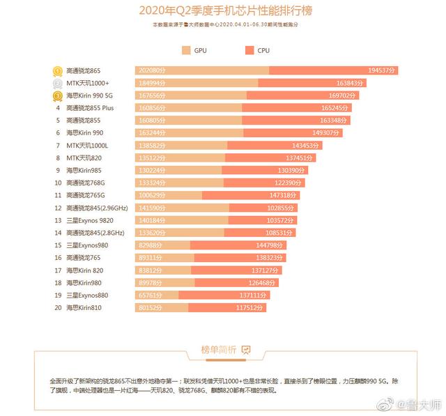 鲁大师发布了2020年Q2季度手机芯片性能排行榜,让我们来看看具体的排名。