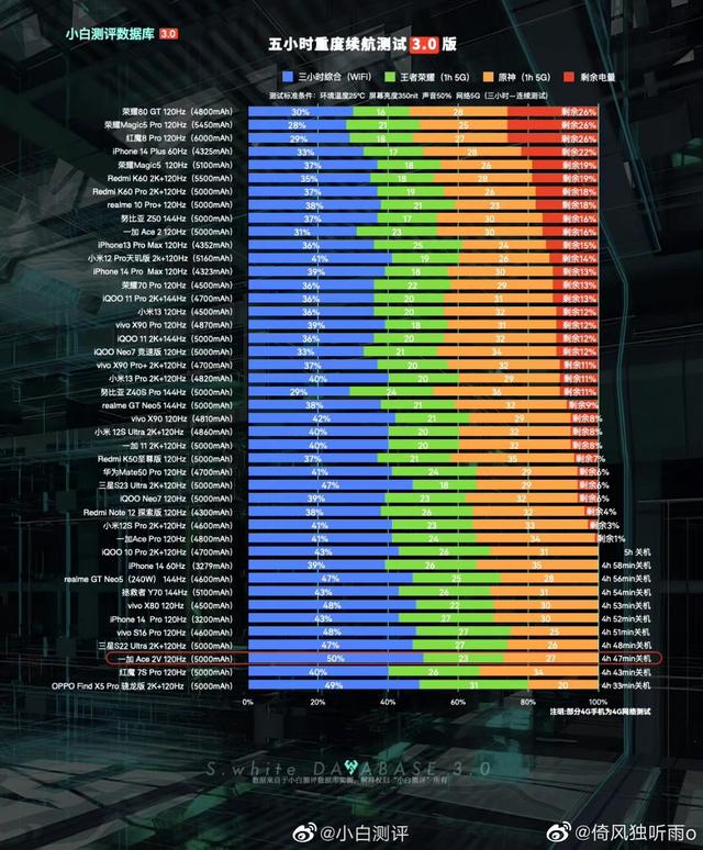 可惜的是虽然营销非常有噱头,但实际体验却做得一塌糊涂,一加Ace2V在游戏场景中的性能竟然跟天玑8200相差不大,发热反而更严重。由于功耗远高于中端芯片,因此这款手机的续航表现也比较糟糕,在小白测评各项测试中,基本都是垫底般存在,5小时重度续航都没有跑完,只用了4小时50分钟左右关机,这可能是今年续航最差手机,甚至不如3200毫安电池续航持久。