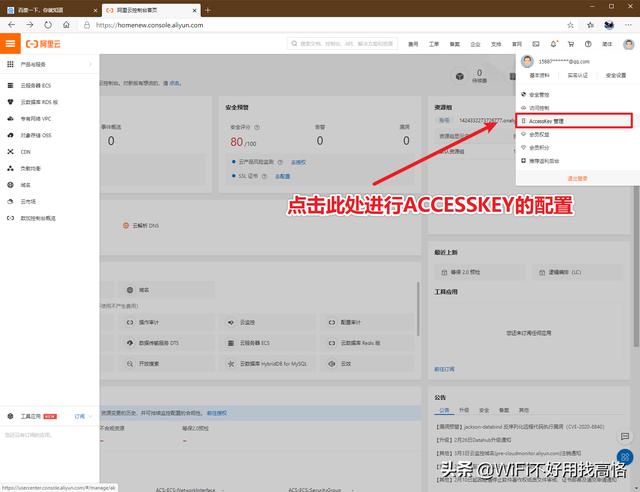 1.入下图所示,登录阿里云后,点击右上角账号头像图标,在弹出的菜单中点击Accesskey管理。