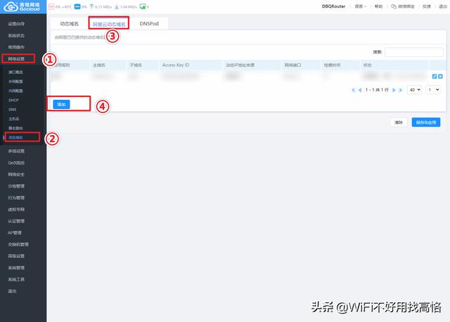 5.登录路由器,然后选择左侧菜单栏:网络设置→动态域名→阿里云动态域名,入下图所示。