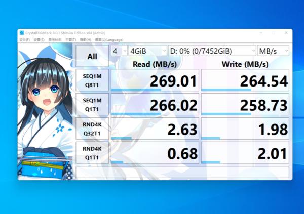 像这款8TB版本的东芝N300,其缓存容量为256MB,转速高达7200RPM。经过实测,顺序读取速度为269.01MB/s、顺序写入速度为264.54MB/s,跟同规格的普通机械硬盘比起来,优势非常明显。