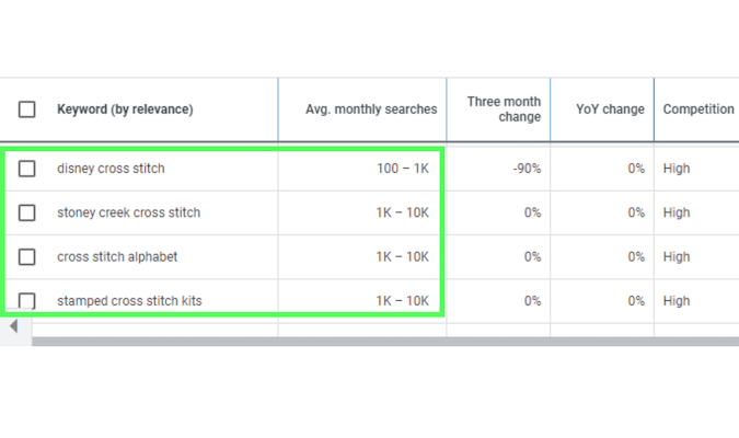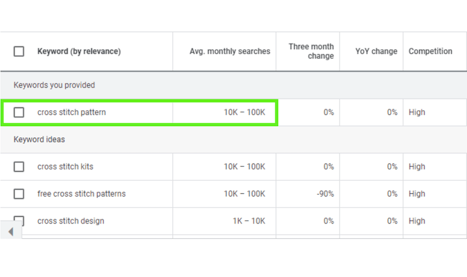 在关键字规划器上快速搜索“cross stitch pattern”可提供大量信息。 首先,对产品有需求: