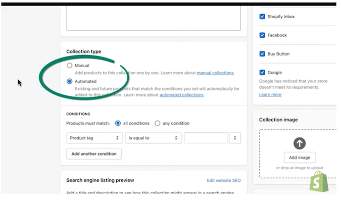 无论哪种方式,您都需要转到“产品”>“集合”,创建一个新集合,并添加条件(标签)(如果是自动的)或产品(如果是手动的)。