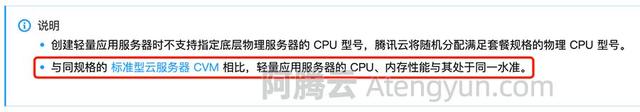 为了证明轻量应用服务器的性能问题,阿腾云去查了下官方文档,有明确说明,同CPU内存配置下的轻量应用服务器和标准型云服务器CVM在性能上是无差别的,轻量与同规格的标准型云服务器 CVM相比,轻量应用服务器的CPU、内存性能与其处于同一水准。