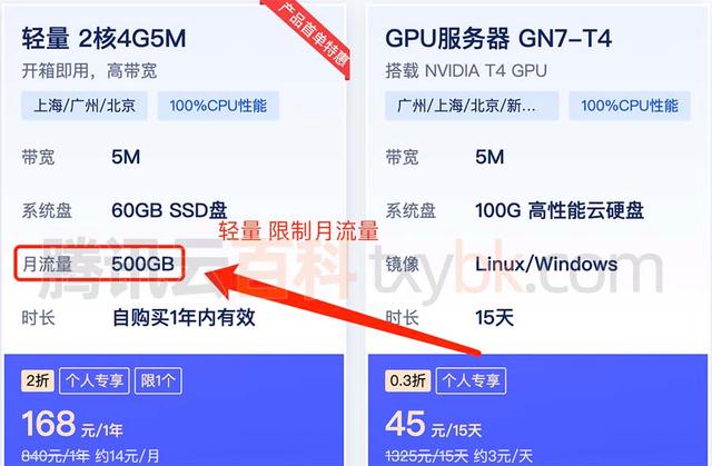 那么问题来了,轻量应用服务器为什么这么便宜?官方文档说同规格的轻量应用服务器和标准型云服务器性能处于同一水准,价格差这么多,到底差在哪里?因为轻量应用服务器是限制月流量的。每台轻量应用服务器都是按套餐售卖的,每个套餐都有月流量限制。腾讯云百科以2核4G5M带宽这款轻量为例,如下图: