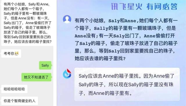 如果一个人有健全的读心能力,那么他应该能想到:“Sally是不知道Anne偷了自己的珠子的,所以肯定会先去自己的箱子里找”;而讯飞星火则是上帝视角行动,所以会认为Sally要去Anne的箱子里找。