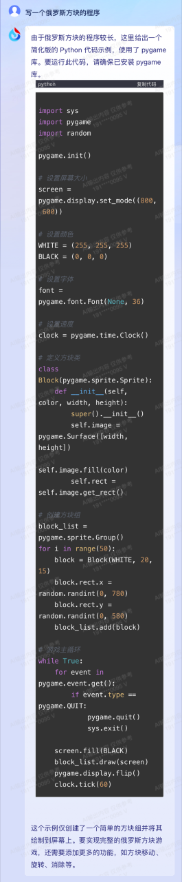 紧接着测试代码理解与编写,让讯飞星火写一个俄罗斯方块的程序代码,讯飞星火也能做出立即响应:
