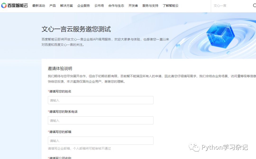 2.填写姓名、联系方式、邮箱、公司名称、职务、企业类型、试用文心一言的业务场景等信息。