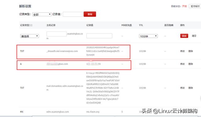 1)、在域名商平台,找到一级域名,然后配置SSL绑定的二级域名信息进行解析,需要做两个配置,一个是二级域名的A类型配置,指定绑定的IP地址,如:A,xx.xxxxx.com,110.113.11.55;和TXT,这个配置需要在点击【进度】查看的信息中获取,见下图