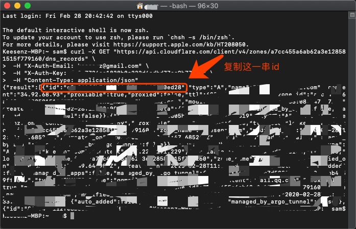 3、在终端中执行以下代码,返回结果中的id就是需要域名的record id,复制备用