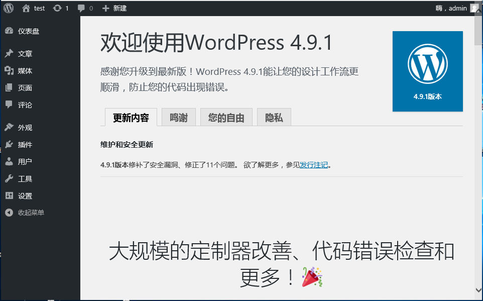 删除容器后重新执行上述docker run..命令,数据库依然完好,数据没有还原。因为站点文件保存在docker镜像中,这时的版本还是恢复到了原厂,且语言变成了英文,于是我把语言改成中文后,再次点击升级至4.9.1版本。。。