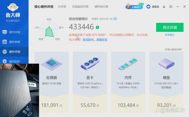 鲁大师跑分43万分,日常轻办公是绝对没问题的,中小游戏、网页游戏也都能对付,之前我用EQ59Pro剪映都提示可以流畅运行,EQ12用来轻度4K视频剪辑自然也不在话下。