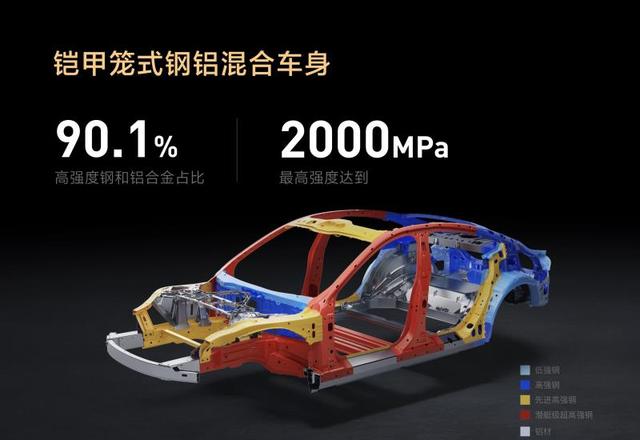 首先,小米SU7采用了铠甲笼式钢铝混合车身,在A柱、B柱、地板梁等关键部位的地方用上了高达2000MPa的超高强度钢,而高强度钢和铝合金的占比达到了90.1%。这样的底盘结构的材料使用,可以为乘员提供非常安全的保障,使乘员舱空间在碰撞中不受入侵。此外,SU7车身结构的设计同样至关重要。