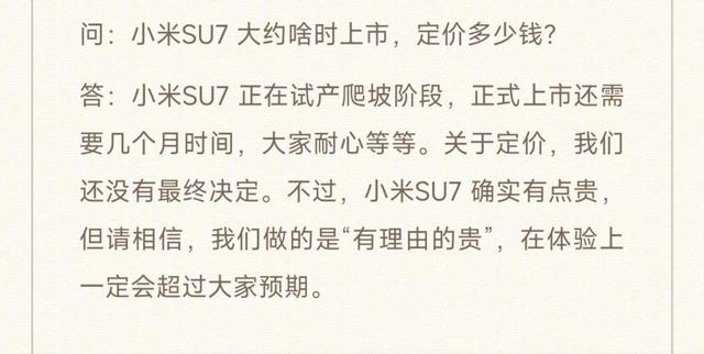 在回答问题的内容最后,雷军表示:“小米SU7还在试产爬坡阶段,正式上市还需要几个月时间,请大家耐心等待。”他的话语中充满了对未来的期待和对产品的自信。