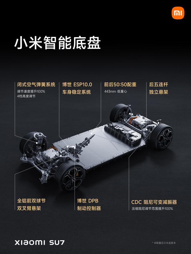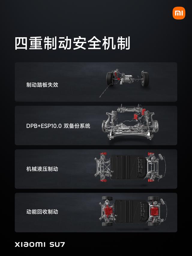 此外,小米 SU7 搭载小米智能底盘,拥有四重制动安全机制,全栈自研底盘控制算法: