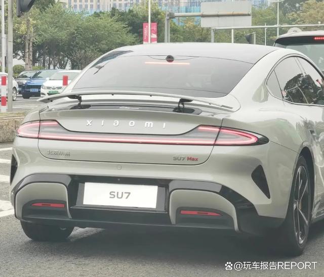 在车尾部分,后挡风玻璃中集成了线性的刹车灯,尾箱末端的鸭尾式尾翼和上方的电动尾翼相呼应,展示着出色的空气动力学表现。下方的尾箱部分镶嵌了贯穿式尾灯组,点亮后呈椭圆状的半环形光源,中间不忘加入“xiaomi”的拼音LOGO。后杠部分则以亮黑色饰板和车身同色饰件收尾,两侧还有着呼应前脸的进气道装饰,和整体风格相统一。
