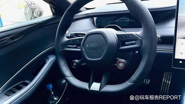 内饰方面配备悬浮式中控大屏、嵌入式液晶仪表盘,和HUD抬头显示组成三屏联动。方向盘的造型非常夸张,采用三九点钟平底结构,两边的握持区域粗壮,内部设计了多枚功能按键,运动属性拉满。管中窥豹,从方向盘造型来看,推测小米汽车的驾驶可玩性非常高。