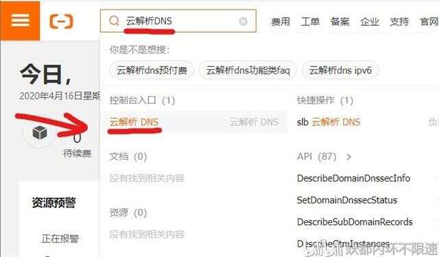 13. 以阿里云为例:我们来到阿里云,登录,在页面左上角搜索“云解析DNS”,然后点击下方的这一选项进入域名解析控制台。