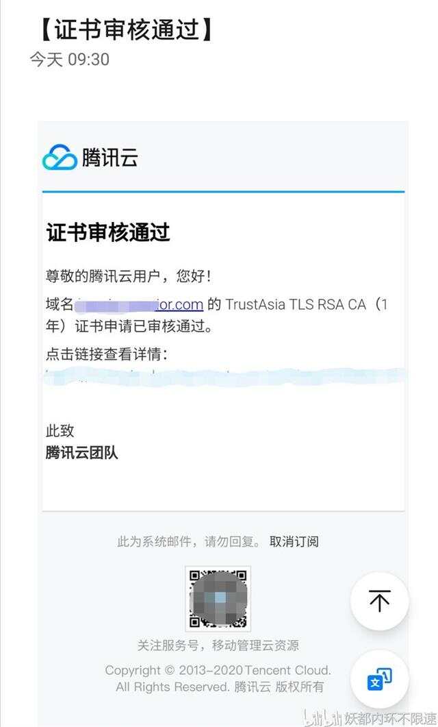 16. 经过10分钟左右的等待,我们的手机上会收到腾讯云发来的短信,邮件和微信通知,告诉我们SSL证书申请已经审核通过,这证明我们已经完成了流程A的操作,下面进入流程B。