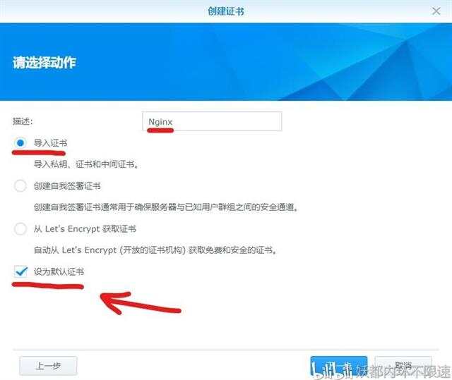 21. 描述可以随便填,我这里填“Nginx”,选择“导入证书”,勾选“设为默认证书”,点击下一步。