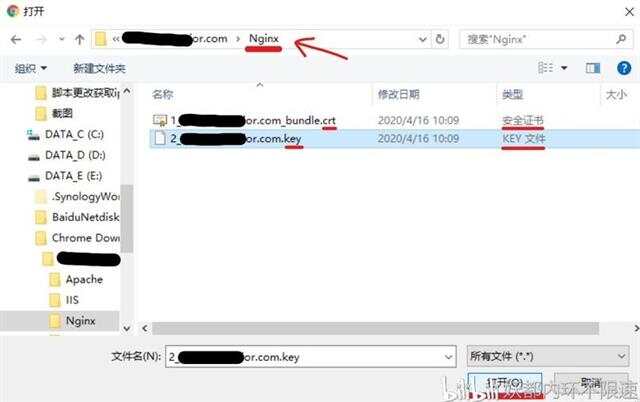 23. 点击“浏览”,找到刚才下载的证书压缩包解压后的文件夹目录。打开图19提到的那个“Nginx”文件夹,其中,证书文件名为“1_你的域名_bundle.crt”,私钥文件名为“2_你的域名.key”,选中后,点击“打开“,就导入到群晖NAS中了。注意,导入要分两次进行,一次只能导入证书或私钥。