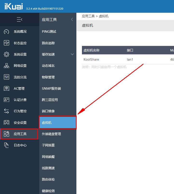 终于,感谢爱快在3.2后版本已经加入了“不务正业”的虚拟机功能,如图1所示,让爱快下面虚拟出一台LEDE设备成为可能,特别是对不支持Vmware的J1900的软路由来说,简直是雪中送炭哪!