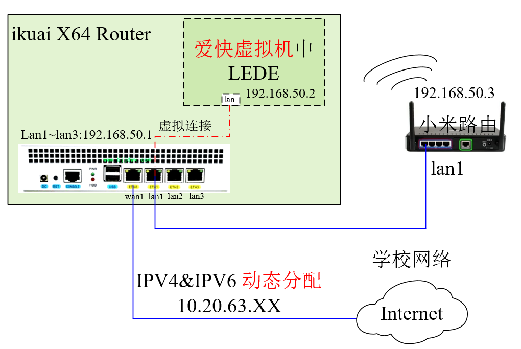2.仅爱快处于路由模式,虚拟机中的LEDE和小米路由器均关闭DHCP功能;
