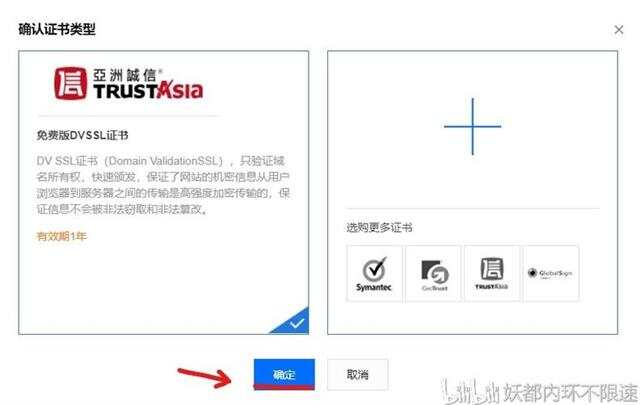 4. 这时弹出“确认证书类型”窗口,要申请的免费证书就如图中所示,点击“确定”。