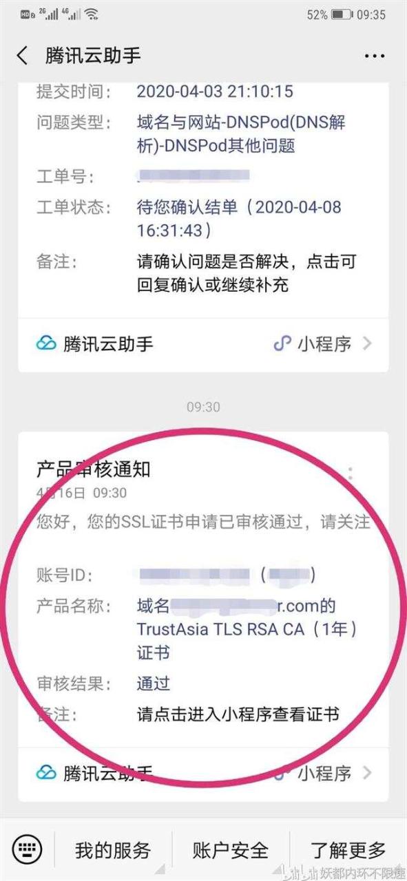 16. 经过10分钟左右的等待,我们的手机上会收到腾讯云发来的短信,邮件和微信通知,告诉我们SSL证书申请已经审核通过,这证明我们已经完成了流程A的操作,下面进入流程B。