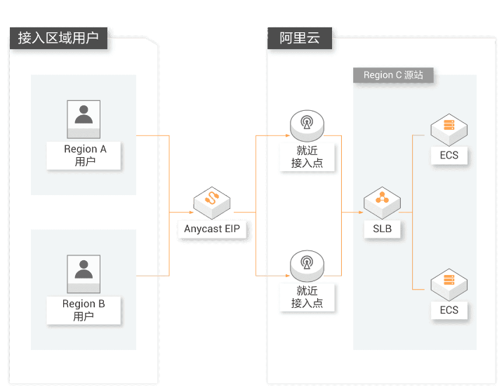 Anycast任播EIP实现全球范围内的公网加速 业务服务器集中部署在区域A,终端用户分布在区域B,用户之间需要大量实时交互,对网络延迟敏感