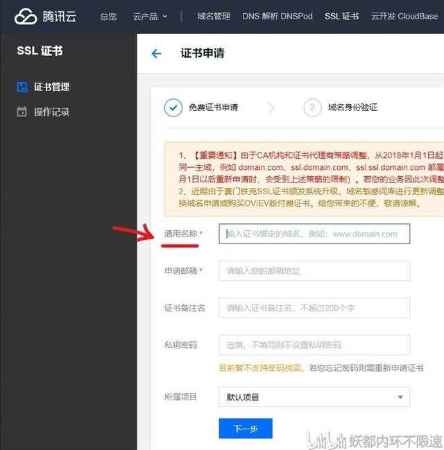 5. 我们来到“证书申请”页面,开始输入第一项“通用名称”,也就是你的域名,如“mynas.com”,“home.mynas.com”,“home.mynas.top”,等等。但这里要注意:你在此申请的免费SSL证书是“单域名DV证书”,它仅对你输入的这一域名有效,举个例子:你输入的域名是“mynas.com”,那这个SSL证书就仅对“mynas.com”有效,对如“home.mynas.com”无效。如果你想安全访问“home.mynas.com”,那你就要重新为这个域名申请一个SSL证书。如果你有特殊需求,也可以自费购买多域名或泛域名型SSL证书,但价格非常高。