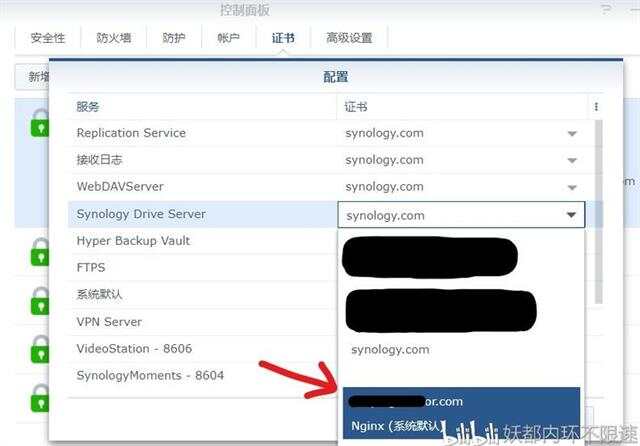 26. 弹出“配置”界面后,把所有“服务”对应的“证书”由“synology.com”全部换成你新申请的SSL证书,最后点击“确定”。