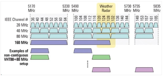 由于5GHz频段与军事雷达频段重合,各个国家对该频段开放程度不同,随着设备更新迭代,以后会有更多5GHz频段信道在Wi-Fi上使用。5.15~5.35GHz和5.47~5.725GHz是全球雷达系统的工作频段,为了避免工作在5GHz频段的无线通讯设备对雷达系统造成干扰,各国对这些设备的要求除了功率、频谱等常规项目以外,还特別增加了对动态频率选择(DFS:Dynamic Frequency Selection)特性的要求。在大多数监管领域,当使用5GHz频段中的部分或全部信道时,802.11客户端需要使用动态频率选择(DFS)。在DFS信道中传输之前,802.11客户端必须验证(通过首先监听60秒)其上没有雷达活动。而且如果802.11 radio在使用DFS信道时检测到雷达,它必须快速腾出该信道,避开雷达使用的信道,因此,切换到另一个DFS信道,这将(至少)有一分钟的中断,所以在您部署网络的时候不建议您使用雷达信道[52、56、60、64]的哦。