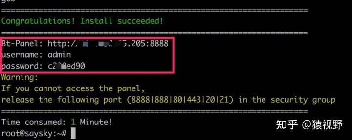 这里会显示宝塔后台地址和账号密码,可以手动复制到记事本暂时存起来。