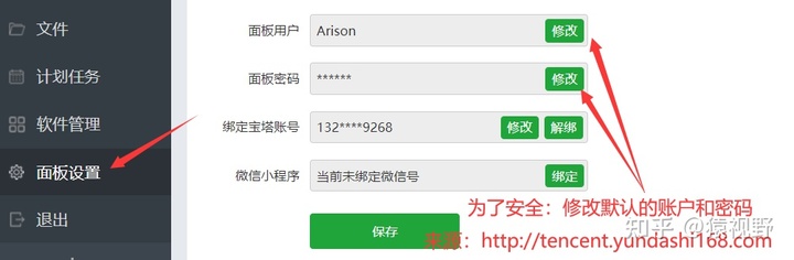 为了安全考虑,在云服务器上安装完成宝塔面板之后,你应该马上修改你的宝塔面板登录账户和密码(注意:这个账户和密码不是宝塔面板官网的,而是每个云服务器访问宝塔面板需要用到的账户和密码)