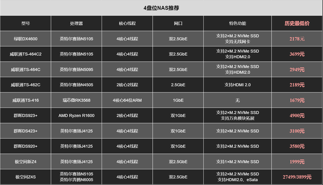本部分有每个市面上在售NAS产品型号表格,包括有品牌型号,所采用的处理器,网口与它的一些特色功能,同时还会提供过去出现过的历史最低价格,供大家参考,在下方的产品介绍中会根据个人经验针对每个产品进行点评,大家根据自身实际情况选择购买。