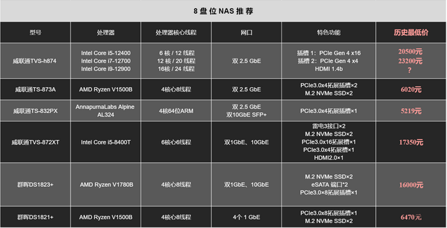 8盘位NAS已经是家用领域到顶的存在,无论是存储容量、设备性能、可拓展性都是最佳的,同样也是最贵的,值得注意的是,威联通与群晖的6盘位AMD处理器的NAS都是性价比不是很高的存在,8盘位AMD高性能设备才是他们的必争之地。