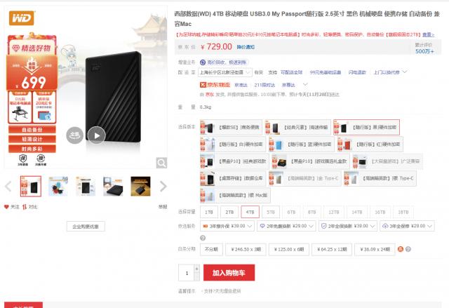 方案二:买一个4TB的移动硬盘,比如西部数据(WD) My Passport随行版4TB 移动硬盘,目前价格约为七百元。(其它几款4tb机械移动硬盘价格也是在七百元左右)